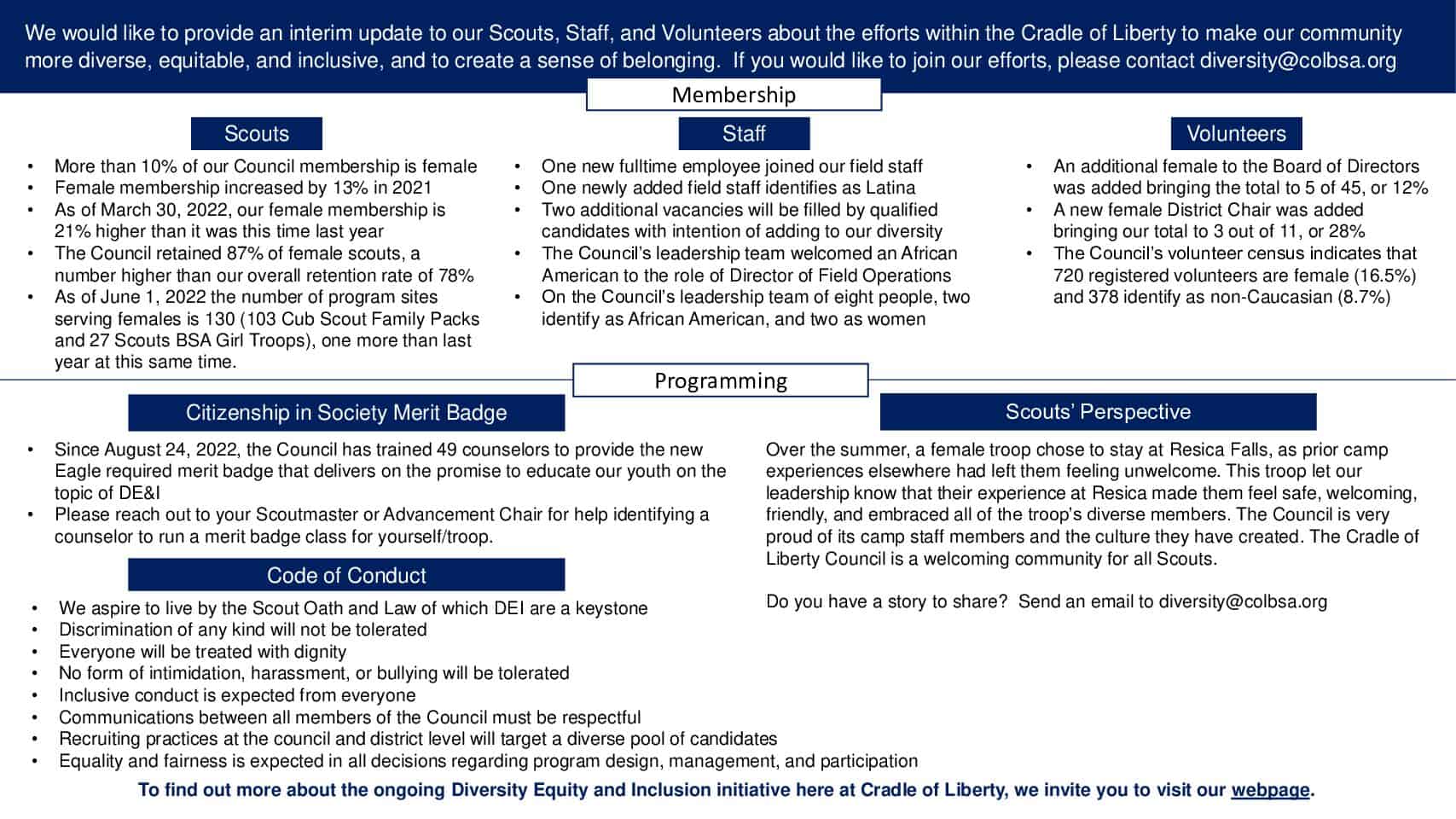 Cradle of Liberty Council is providing content related to DEI to be shared with our community of Scouts, Volunteers, and Staff. It will be provided as content for inclusion in electronic District Newsletters, and as “DEI Minutes” to be communicated verbally by unit leaders at in-person events. This short-form nugget will celebrate DEI in our community. Content can include interviews, success stories, facts, helpful hints, and other matter.